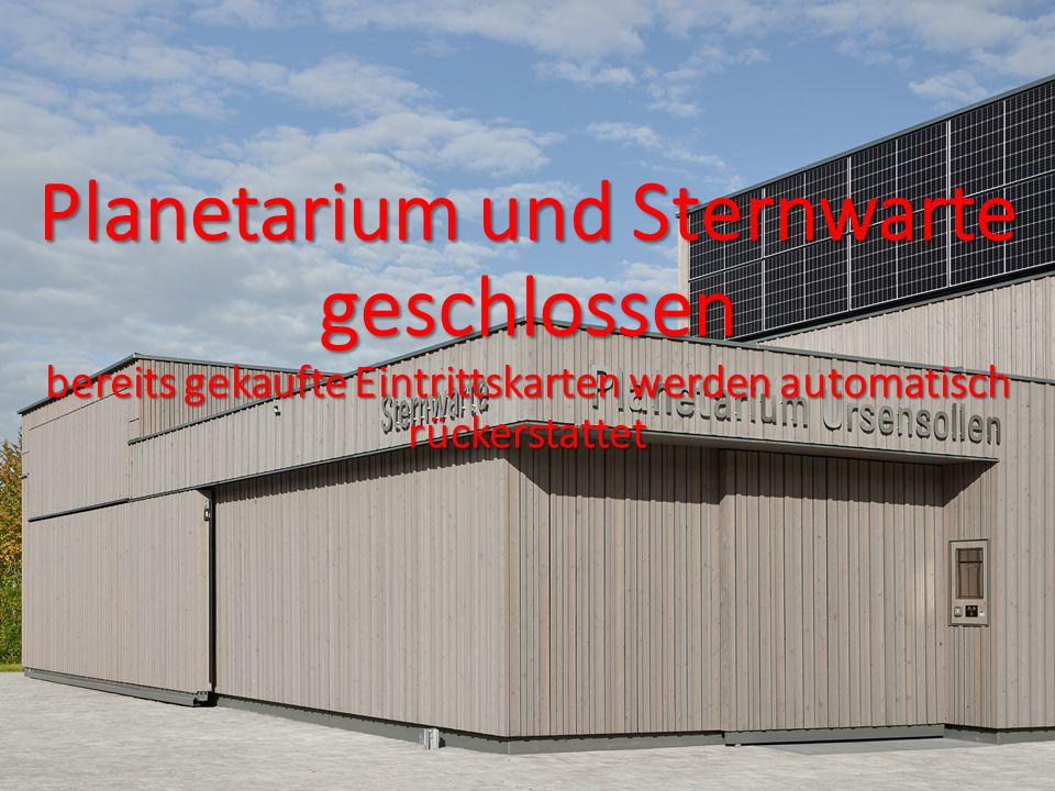 Auf Grund der neuen Coronaregeln in Bayern müssen wir Planetarium und Sternwarte ab sofort für alle öffentlichen Veranstaltungen leider schließen.