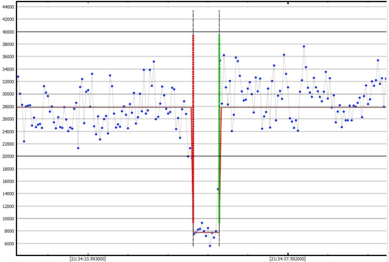 Die Neutraublinger Lichtkurve zeigt bei einer Belichtungszeit von 40 Millisekunden pro Bild eine kleine Stufe zu Beginn der Bedeckung und dann einen Abfall der Lichtkurve auf einen Level, der aber deutlich über dem des erwarteten Lichtabfalls