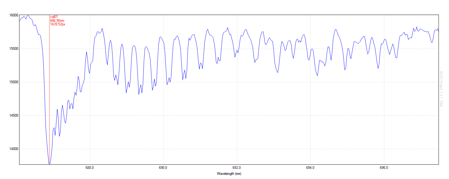 Um Messfehler auszuschließen, habe ich zeitgleich eine Serienaufnahme der O2 Absorptionslinie (Frauenhofer B-Band) bei einer Wellenlänge von 686,7 nm bis 688,4 nm aufgenommen. Dieses Absorptionsband entsteht in der Erdatmosphäre und unterliegt demzufolge keiner Wellenlängenverschiebung.