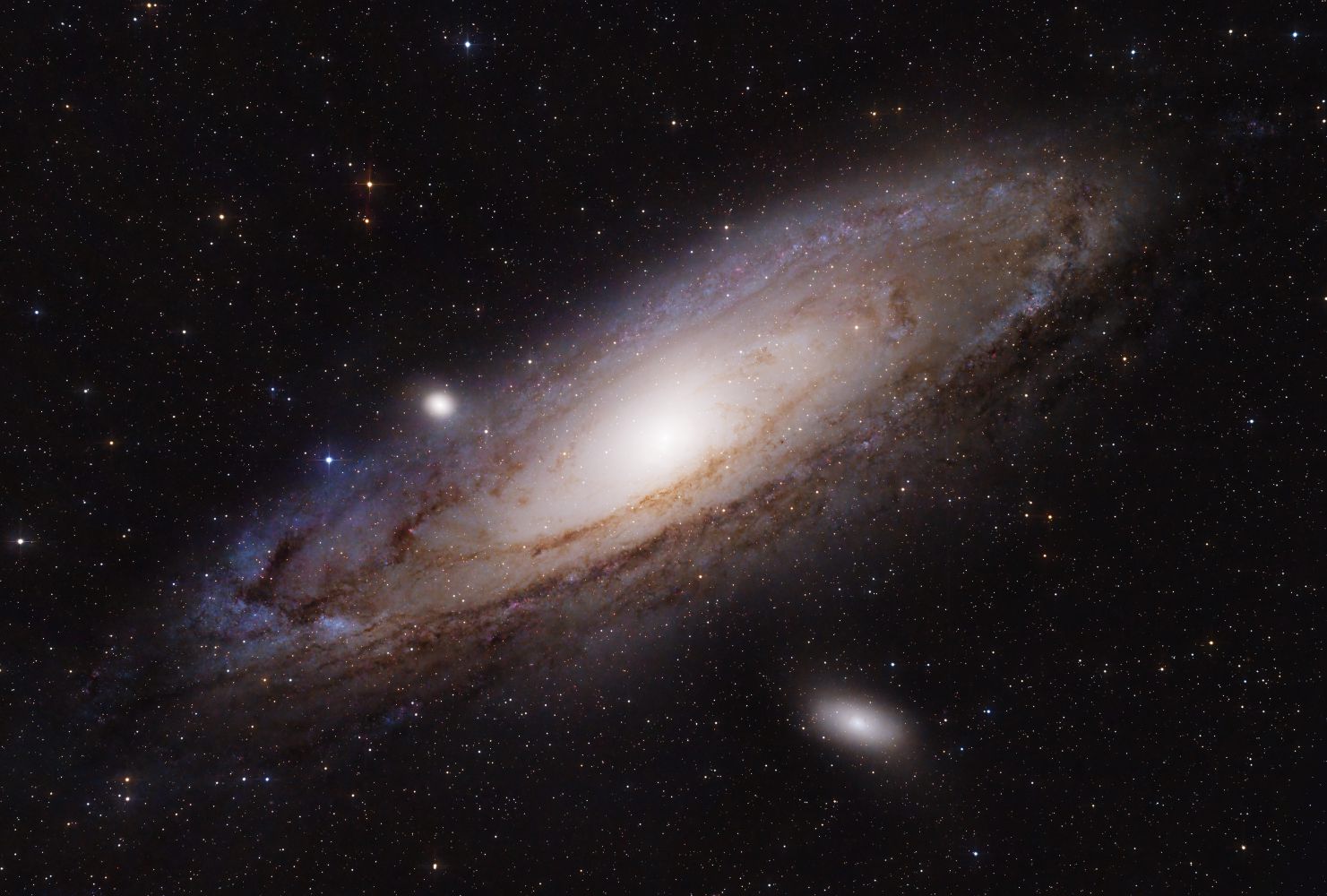 Der Andromedanebel (M31, NGC 224) ist eine Spiralgalaxie im gleichnamigen Sternbild in einer Entfernung von etwa 2,5 Millionen Lichtjahren. Sie ist die unserer Milchstrasse nächstgelegene Spiralgalaxie und die größte Galaxie der sogenannten Lokalen Gruppe, die aus M31, der Milchstrasse, der Dreiecksgalaxie und etwa 30 Zwerggalaxien besteht. Sie enthält eine Trillion (10^18) Sterne und übertrifft damit unsere Galaxie deutlich. Die Andromedagalaxie ist eines der hellsten Messierobjekte und kann mit bloßem Auge beobachtet werden, auch wenn damit nur ein Teil ihrer enormen Ausdehnung von sieben Vollmonddurchmessern sichtbar wird. M31 ist eines der wenigen Objekte, das sich unserem Sonnensystem annähert. Sollte M31 auf Kollisionskurs sein, werden sich die beiden Galaxien gegenseitig durchdringen und eine neue riesige elliptische Galaxie bilden. Aufnahmen von Galaxien sind wegen des enormen Kontrastes zwischen galaktischem Kern und den Spiralarmen immer eine Herausforderung für den Astrofotografen. Christian Meier ist hier trotzdem ein fantastischer Blick auf unseren galaktischen Nachbarn gelungen.