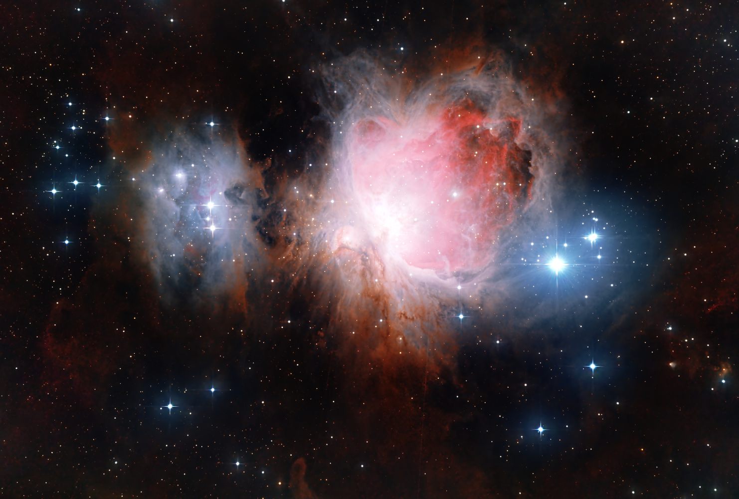 Der Große Orionnebel (Messier 42, M42 oder NGC 1976) ist ein Emissionsnebel südlich des bekannten Gürtels des "Jägers" im Sternbild Orion. Er ist einer der hellsten Nebel am Nachthimmel und mit bloßem Auge sichtbar. M42 ist etwa 1300 Lichtjahre von der Erde entfernt und damit die uns nächstgelegene Sternengeburtsstätte. Der Orionnebel ist eines der bekanntesten und meistfotografierten Deep-Sky-Objekte und hat den Astronomen viele bahnbrechende Erkenntnisse über die Geburt von Sternen und Planeten aus kollabierenden Gas- und Staubwolken gebracht. Die über 24 Lichtjahre ausgedehnten Wolken werden von vier eng beieinander liegenden, jungen Riesensternen beleuchtet, die ein Trapez bilden, das in guten Amateurteleskopen aufgelöst werden kann. Das Bild von Christian Meier zeigt noch eine weitere nebelhaft leuchtende Region nördlich (links) von M42, die wegen ihrer frappierenden Form "Running Man" (NGC 1977) genannt wird.