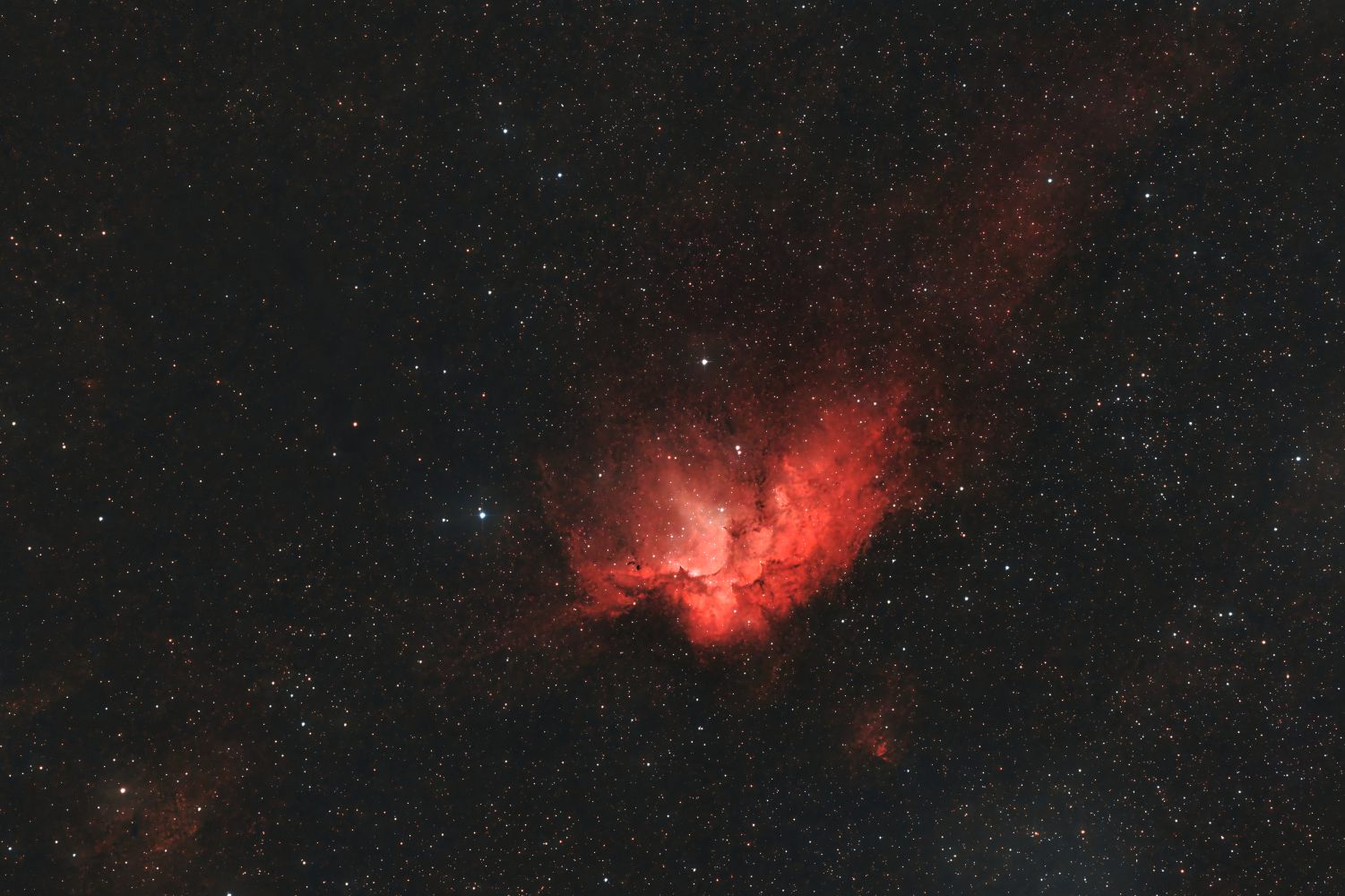 Die Materie des Nebels (hauptsächlich Wasserstoff) wird durch benachbarte junge heiße Sterne vorwiegend im roten Licht des ionisierten Wasserstoffes zum Leuchten angeregt.