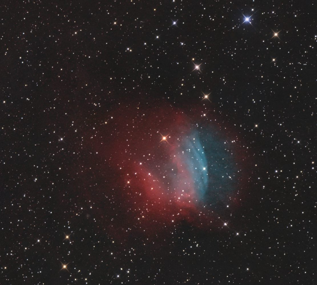 Der große Hantelnebel (Messier 27) ist ein planetarischer Nebel im Sternbild Füchschen in einer Entfernung von etwa 1360 Lichtjahren. Es war der erste planetarische Nebel den Charles Messier 1764 entdeckte. Wegen seiner Helligkeit und Ausdehnung ist er bereits mit Ferngläsern aufzufinden und für Amateurteleskope ein berühmtes Beobachtungsziel. Planetarische Nebel (der Name kommt von ihrer Ähnlichkeit im Aussehen mit großen Planeten, wenn sie durch historische Teleskope betrachtet werden) sind die Überreste sterbender Sterne mit Massen kleiner als der doppelten Sonnenmasse. Wenn am Ende des Sternlebens der Wasserstoff im Innern verbraucht ist hört die Kernfusion auf und die Sternhülle wird in der Folge in den Weltraum abgestoßen. Sie bildet eine leuchtende Blase aus Gas um den verbliebenen weißen Zwerg im Zentrum. Aller Wahrscheinlichkeit nach wird unsere Sonne in etwa 5 Milliarden Jahren ebenfalls als planetarischer Nebel und weißer Zwerg enden.